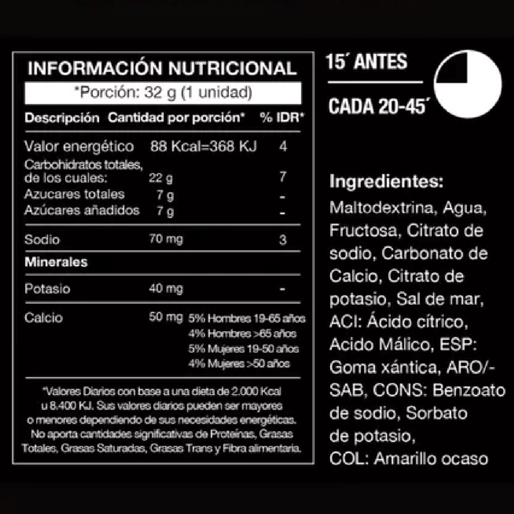 En actividades deportivas intensas y de larga duración como maratones, ciclismo o triatlones los atletas necesitan incorporar carbohidratos de una manera rápida y sencilla. Este suplemento en gel aporta la energía que el organismo requiere ante este tipo de desgaste y puede ser consumido durante el ejercicio físico. Es recomendable probar esta estrategia nutricional con anticipación en este tipo de competiciones.